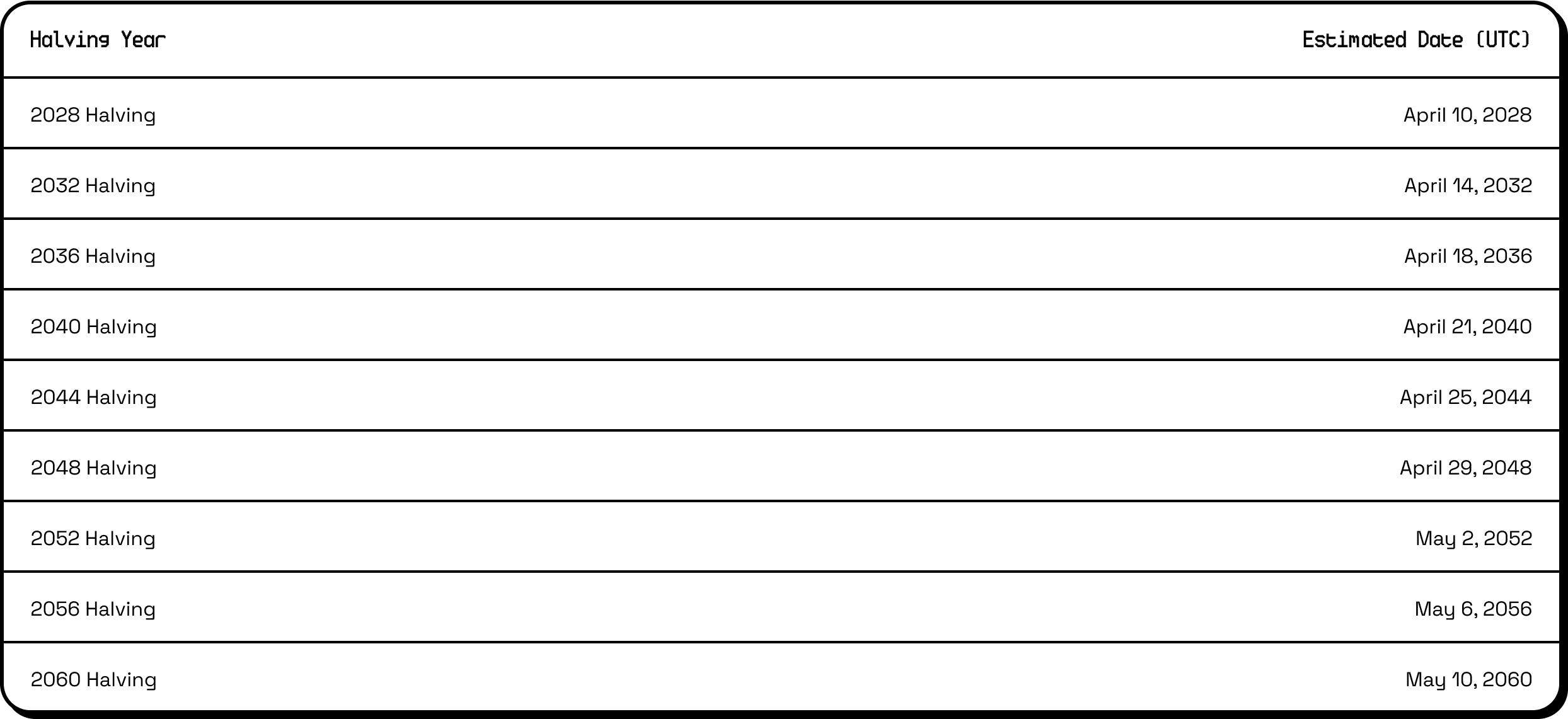 We'll adjust this based on block times, but as of now here are the estimates for the 2028 through 2060 Bitcoin halvings.