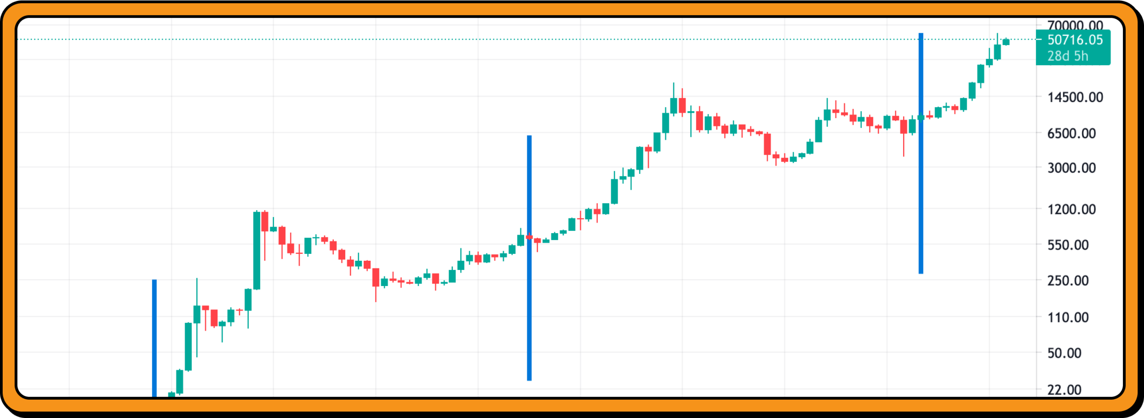 In the image above, the vertical blue lines indicate the previous three halvings (2012-11-28, 2016-7-9, and 2020-5-11). Note how the price has jumped significantly after each halving.