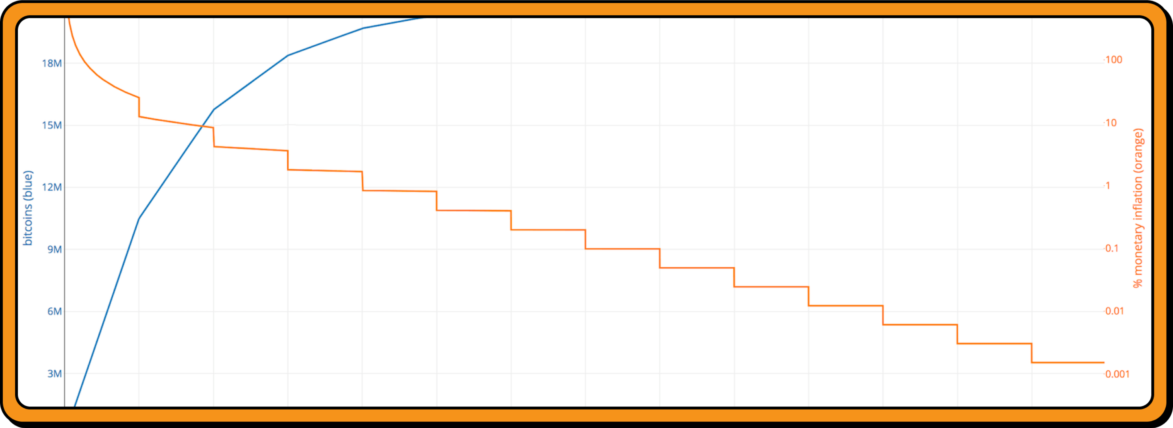 Each halving lowers Bitcoin's inflation rate. The orange line is Bitcoin's inflation rate during a given period, while the blue line is the total number of bitcoins issued.